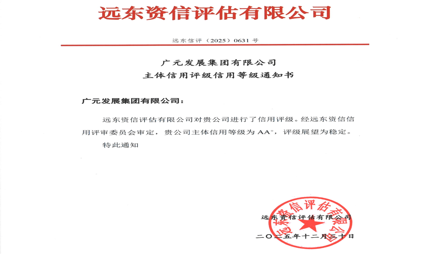 近期,广元发展再次获得国内权威专业评级机构远东资信评估有限公司AA+主体信用等级,评级展望稳定。广元发展作为市属国有资本运营头部功能性企业,将充分发挥示范引领作用,以高信用评级为支撑,持续推动产业转型升级,为高质量发展注入强劲动力,坚定扛起城市经济建设主力军重任,为地方经济社会发展贡献更大力量。