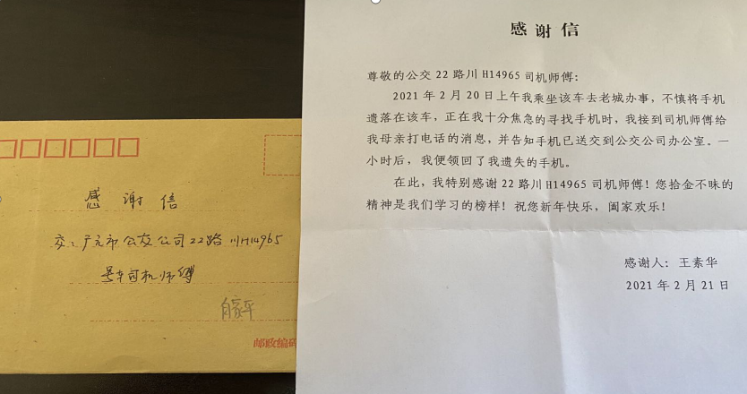 2月20日,市民王女士乘坐22路川H14965号公交车,不慎将手机遗落在车内。当班驾驶员白家平在到达终点站116厂后拾到该手机,当即主动通过电话联系到失主母亲,第一时间将手机交到公交公司办公室。失主王女士在短短一小时时间便找回了遗失的手机。