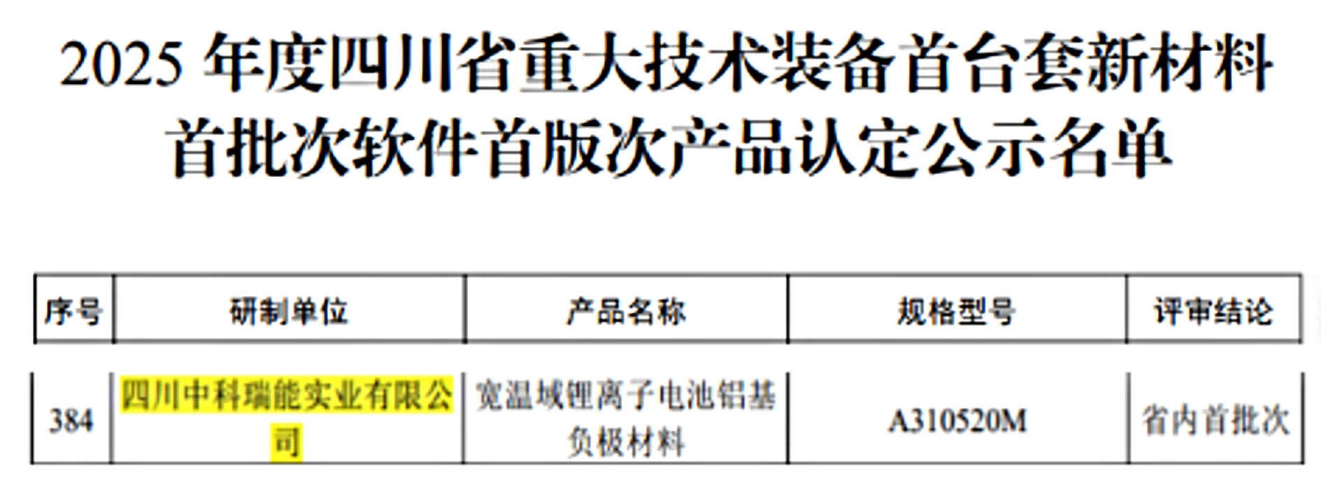 按照《四川省重大技术装备首台套新材料首批次软件首版次认定管理办法》(川经信装备〔2021〕124号)规定,经济和信息化厅已按程序对2025年度申报的四川省重大技术装备首台套新材料首批次软件首版次产品进行了专家评审,共计449个产品通过专家评审。其中,四川中科瑞能实业有限公司宽温域锂离子电池铝基负极材料获得2025年度四川省新材料首批次产品认定。