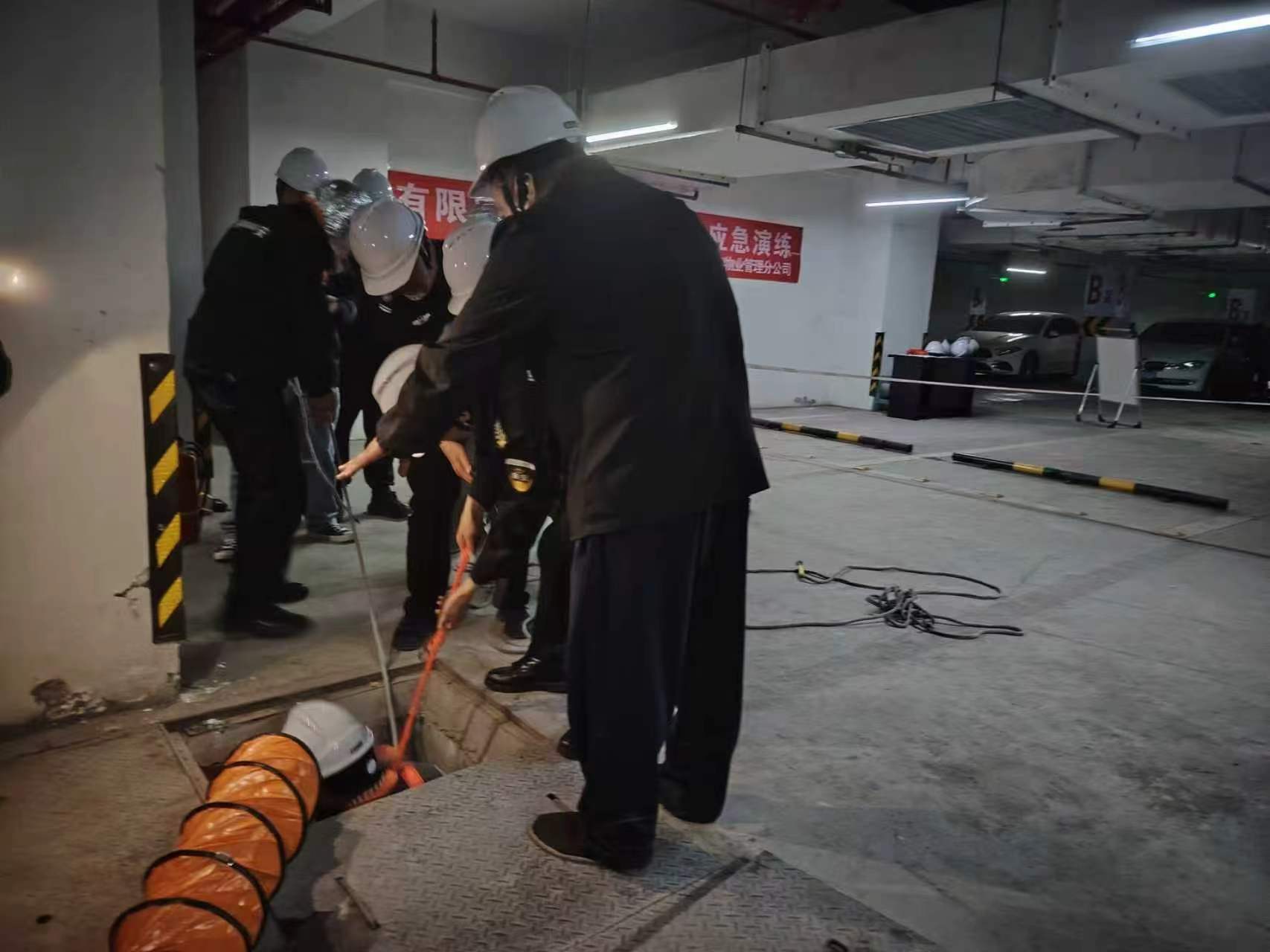 作业实操严格执行“先通风、再检测、后作业”的原则,采取强制性持续通风措施,对有限空间内气体进行全面检测,并根据检测结果对作业环境危害状况进行评估,确保整个作业期间处于安全受控状态。作业全程设专人监护,实时管控环境与人员状态,规范设置警示标识、划定作业区域。应急演练模拟小区消防池管道清掏时因通风不畅、有害气体积聚导致作业人员中毒昏迷的突发事故,主要负责人、现场监护人、作业人员、现场安保组、应急救援人员严格按照应急预案,快速响应、高效联动、规范处置。